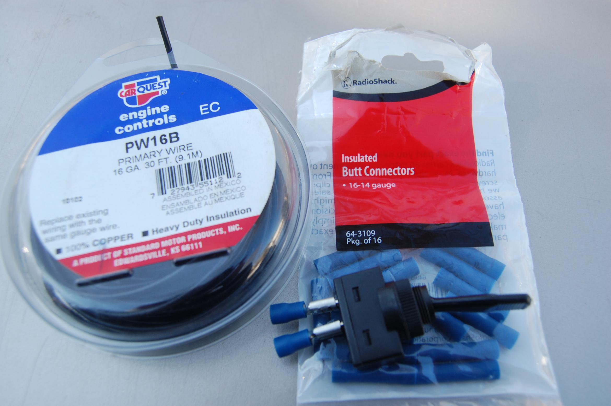 I have an 87 NA, I have a 25a switch, the appropiate female connectors, 16 gauage wire and butt conncetors, see photo below.