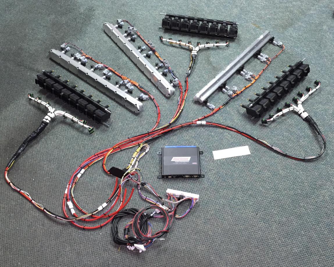 The fuel injection system is on the engine, fuel rails, 24 id 2200cc injectors, 24 coils, Adaptronic computer, we burned up the starters trying to get all the sensors set up on the engine so we have not dynoed it yet.