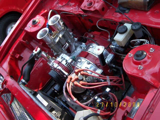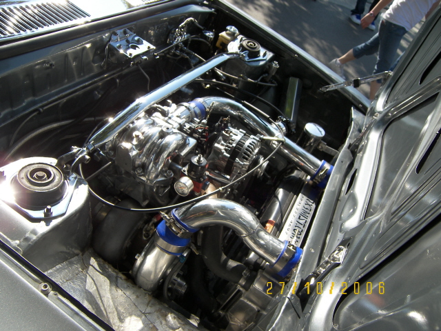 1973 dodge colt (mitsu galant) 2.4 DOHC eclipse motor with a gt35 non BB turbo. cams blah blah blah. it has a th-350 tranny and a ford 9" with 3.50s in the rear.