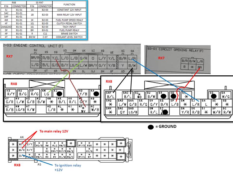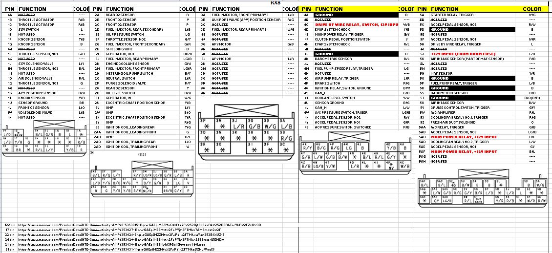 So this is the big one, the one that took me the longest to crack. The RX8 PCM really isn’t that complicated when it comes down to it. It’s a mess of wires and it’s just a matter of figuring out what each one does. I made this spreadsheet that spells out each pin for every connector. Connectors 4 and 5 are the ones you'll be interested in.