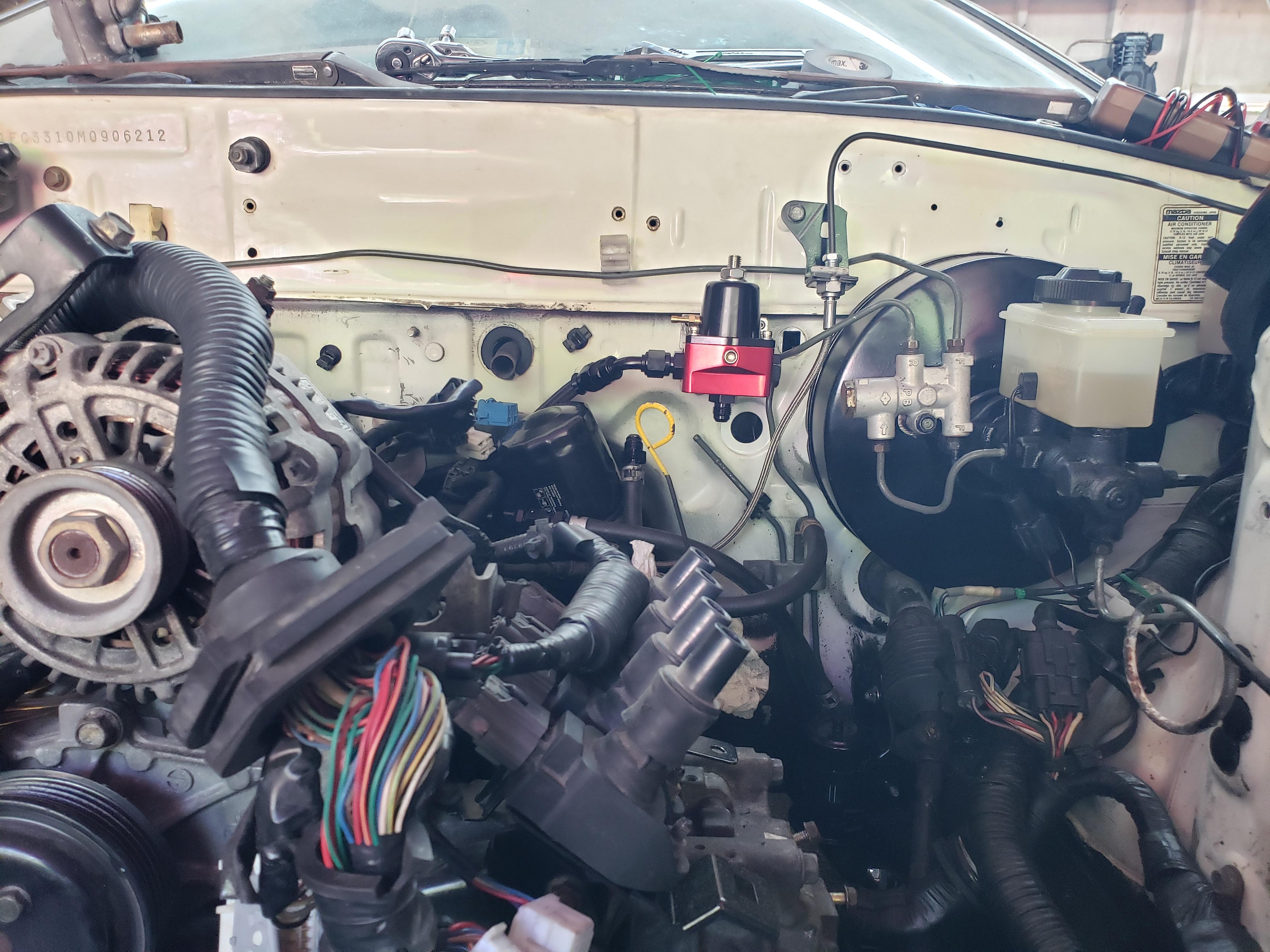 If you go this route, you will need a fuel pressure regulator. From what I can tell the stock RX8 fuel pressure is round 60psi and does not rise with engine load. I put mine here, adjusted to 60psi, and just didn’t connect the rising rate vac hose.