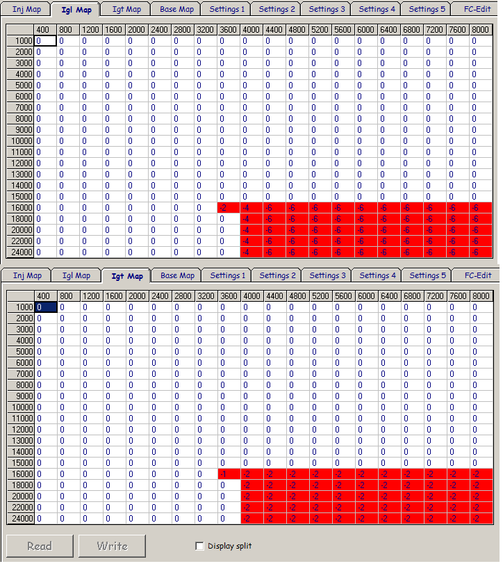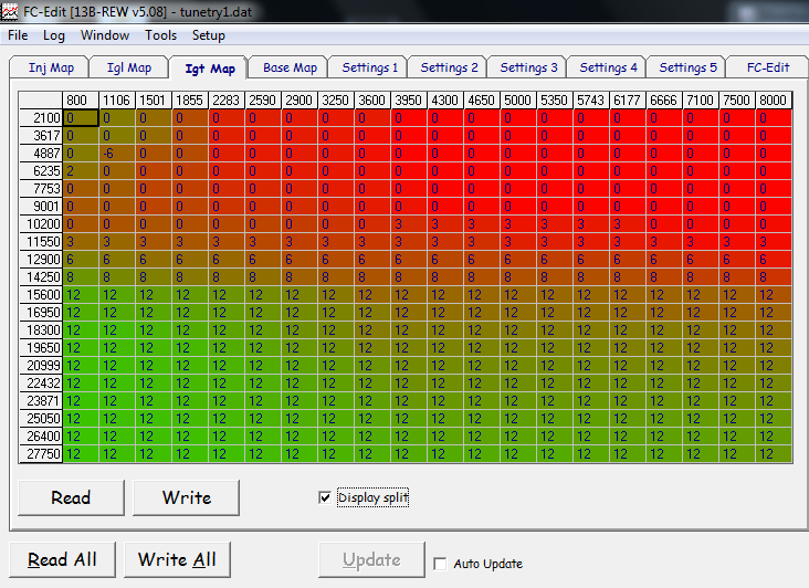 As for split, well there are different ways of doing things. 10 degrees is ok. I like to add more split at higher boost levels, up to a max of 15 split. The reason I do this is purely for safety--it might cost a couple HP. As a safe starting point I like to run maybe 10 degrees below 10psi. Then 12 degrees at 10psi, ramping to 15 degrees at 1 bar and higher. Other tuners run less, but I prefer this as a starting point. Then if I have enough dyno time available I'll start playing around... basically reduce split (which advances trailing timing) and see if that picks up much power. Then you make the judgment call--ok, so I reduced split by 3 degrees, how much power did that give me? Is the presumed marginal decrease in safety worth the marginal increase in horsepower?