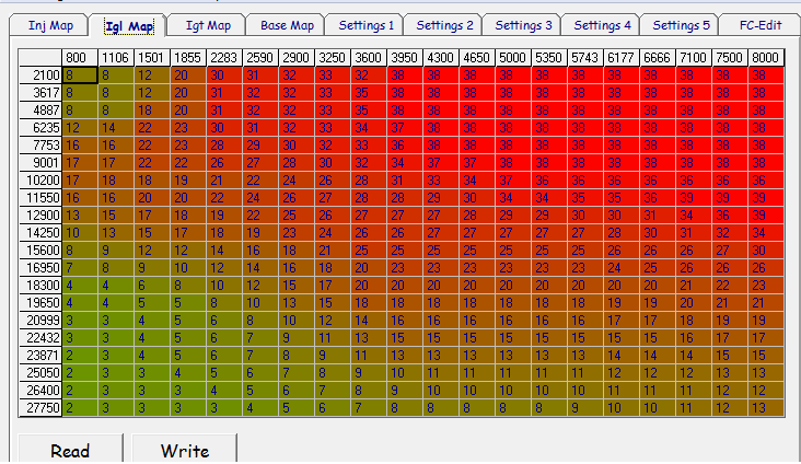 For one a general rule of thumb for tuning to even start without blowing your **** is 15deg Ltiming for 15psi of boost, so 15 for15. and after peak torque you only need to advance a degree or two not 5 like u have. another thing is i noticed is your split. Really you dont need split in vacume but what i do is make all vacume 2 on split map and boost i just make them all 12 split. You really are not going to make more than a couple hp with less split and its ten time safer to run more split instead of making your split map look like a timing map. In a few i will post a few of my maps when i was making 535hp on 20psi and i also have a folder of info that i actually paid for and the best one is the tables for map senor for rescaling all you do is enter numbers and it does the math for u.