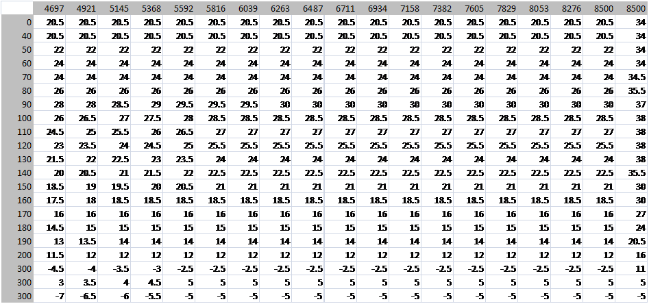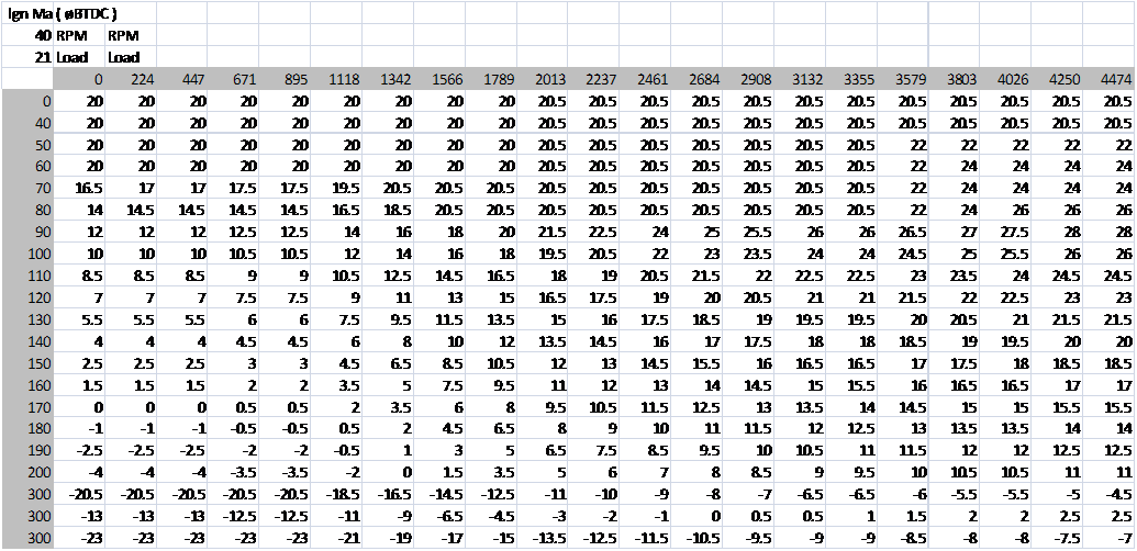 Here is my main timing MAP. It was created for me by a tuner a while back. Due to many factors, I doubt he spent much time on it. I do remember we had some off-idle driveability issues, so he changed the timing there in an attempt to improve it.