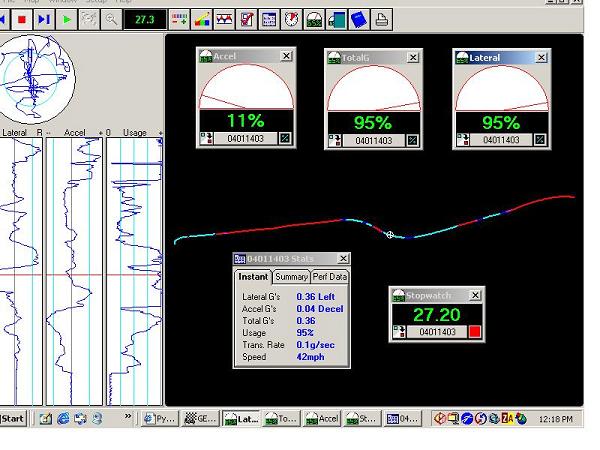 The total g's plotted aren't that high but the street was wet so I was using all the tires had, therefore my "usage" on Geez rates high.At the top left is the friction circle. I accidently cropped it off but the cursor on the friction circle represents the point on the map where the white bullseye is. The gauges on the map represent parameters present at the bullseye as well. It shows me in a slight left turn, slowly accelerating while using 95% of the available grip 27.2 seconds from the beginning of the run. The strip charts on the left show lateral g's, accel g's and total usage. The redline across the strip charts coincides with the bullseye on the track map. Total usage is how much of the tire is being used; 100% braking, 100% accel, 100% cornering or a mixture of each. The more time usage is at the extreme left or right the more of the tire you are using. Transitions in usage are transitions in either speed or direction.