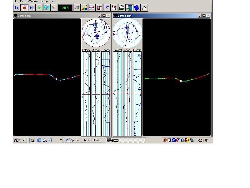 ), so therefore I was not using much of the tires. If I had been accelerating hard in those straight lines they would have been plotted at a higher usage percentage.I'm just learning how to use this and plan to race with it all season. The beauty of Geez is that it records these runs and then can play them back in real time overlayed with eachother, as many runs/ consecutive laps as you're computer processor is capable of running. 10 isn't a problem for most apparently. You can immediately see what was different lap to lap and at the same time have hard data. All this comes from a small 2" cube hooked up to a Palm computer. The Palm can store 25 continuous minutes of data and is capable of self starting and stopping itself. It does this by beginning to record once a certain accel threshold is reached and by stopping once a certain decel threshold is reached and maintained for a certain length of time. The thresholds and lengths of time are all user controllable. I had the system on and it began recording when I dumped the clutch from the stop sign; it then stopped after I was parked at the light.