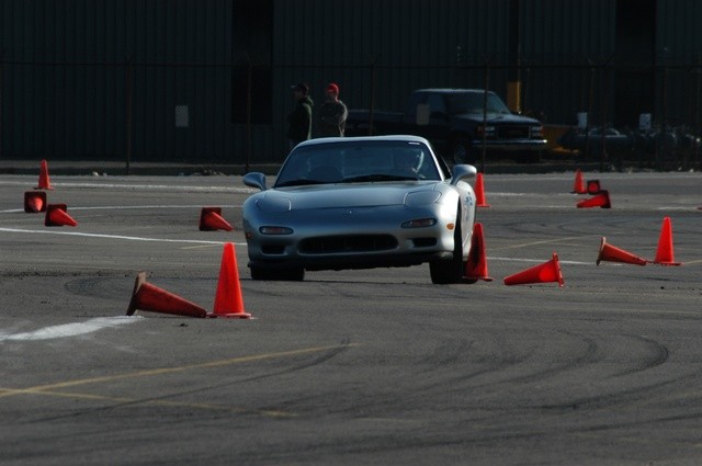 Depending on where the slalom is you may find yourself needing to accelerate through the slalom or slow down. In those instances you have to be balancing your hands with your feet. If you need to use more of your hands (steer) you should be using less of your feet (brake or gas). This is why the key is to turn so early behinds the cones: by not needing as much steering you can automatically carry more speed without sliding. Most newbs get behind in the slalom; they turn later and later as they progress through and this leaves them needing big steering inputs to round the last cone or two. If they don't slow the car this will leave the car slow at best or sideways/backwards at worst.