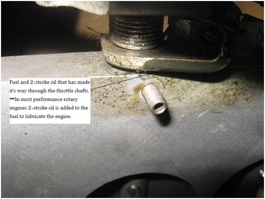 To verify the path of the pressure in the throttle shafts a test using UV dye was performed. There are two directions the pressure can flow in the throttle shafts. If the pressure flows to the exterior of the throttle body it is a boost leak. This prevents the fuel from leaking past the throttle shafts, but creates a small leak in the air system. If the pressure flows to the interior of the throttle body it is a throttle leak. Again this prevents a fuel leak, but can allow air to bypass the throttle plate which in theory would make the engine surge (much like a sticky blow off valve) or create idle issue. Due to the small volume of air that can travel through the throttle shafts neither surging or idle issues are likely.