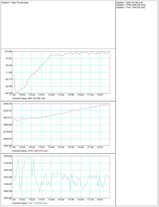 Figure 12 Snap shot of data log of test drive with new throttle body. Maximum boost pressure was 107 KPA (15.5 PSI). Trim is AFR, were 1416 equals 14.16 AFR.