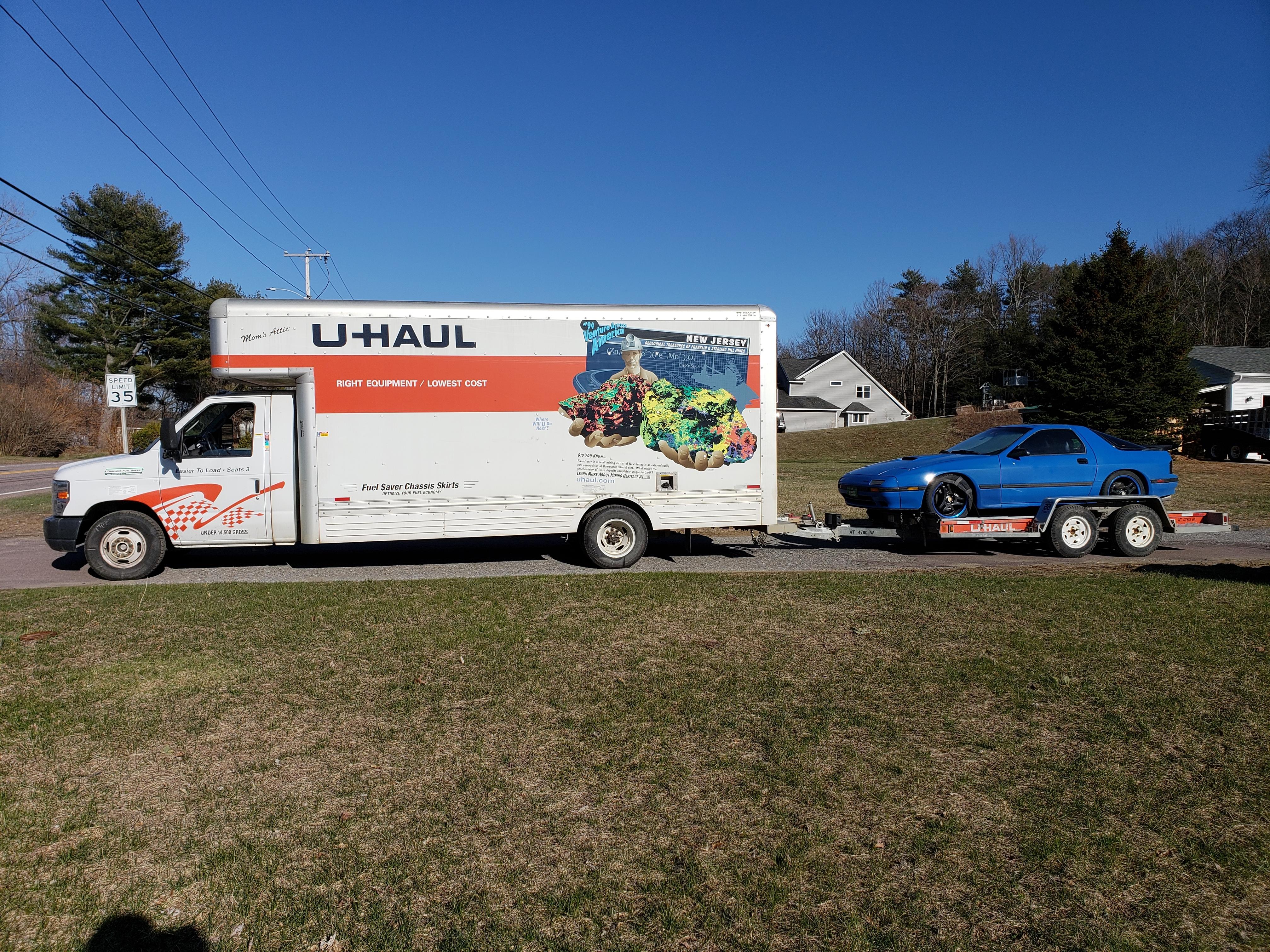 Bit of a change of plans.. one 26 foot uhaul and a 12 foot trailer are not enough! So getting a 20 foot uhaul for me to drive towing the rx7 behind it.