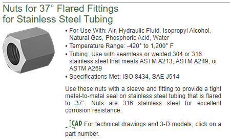 I use McMaster JIC stainless (also available in brass for less$) 37 degree sleeves (ferrules) and nuts and single-flare the tubes to 37 degrees with a Ridgid flaring tool that so far has made flawless flares.