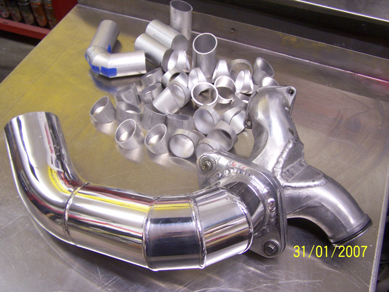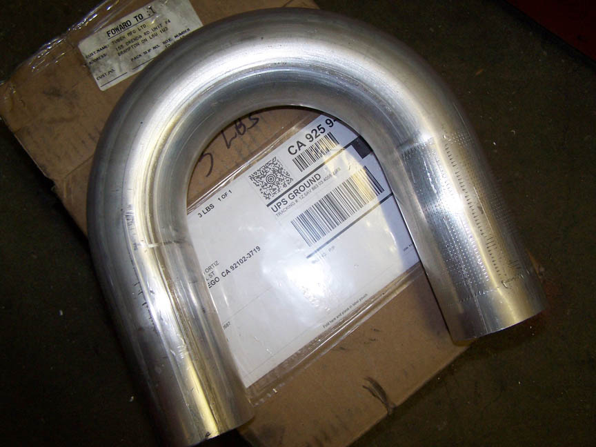 I purchased my piping off ebay, just 90's with about 16" of straight on each. Nice thick walled polished aluminum. I searched this morning and couldn't find the specific vendor. Regardless of what you get, there is going to be cutting, welding and bead rolling. If you buy piping with couplers from Ebay, just pitch the couplers in the garbage, they are worthless.