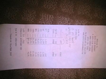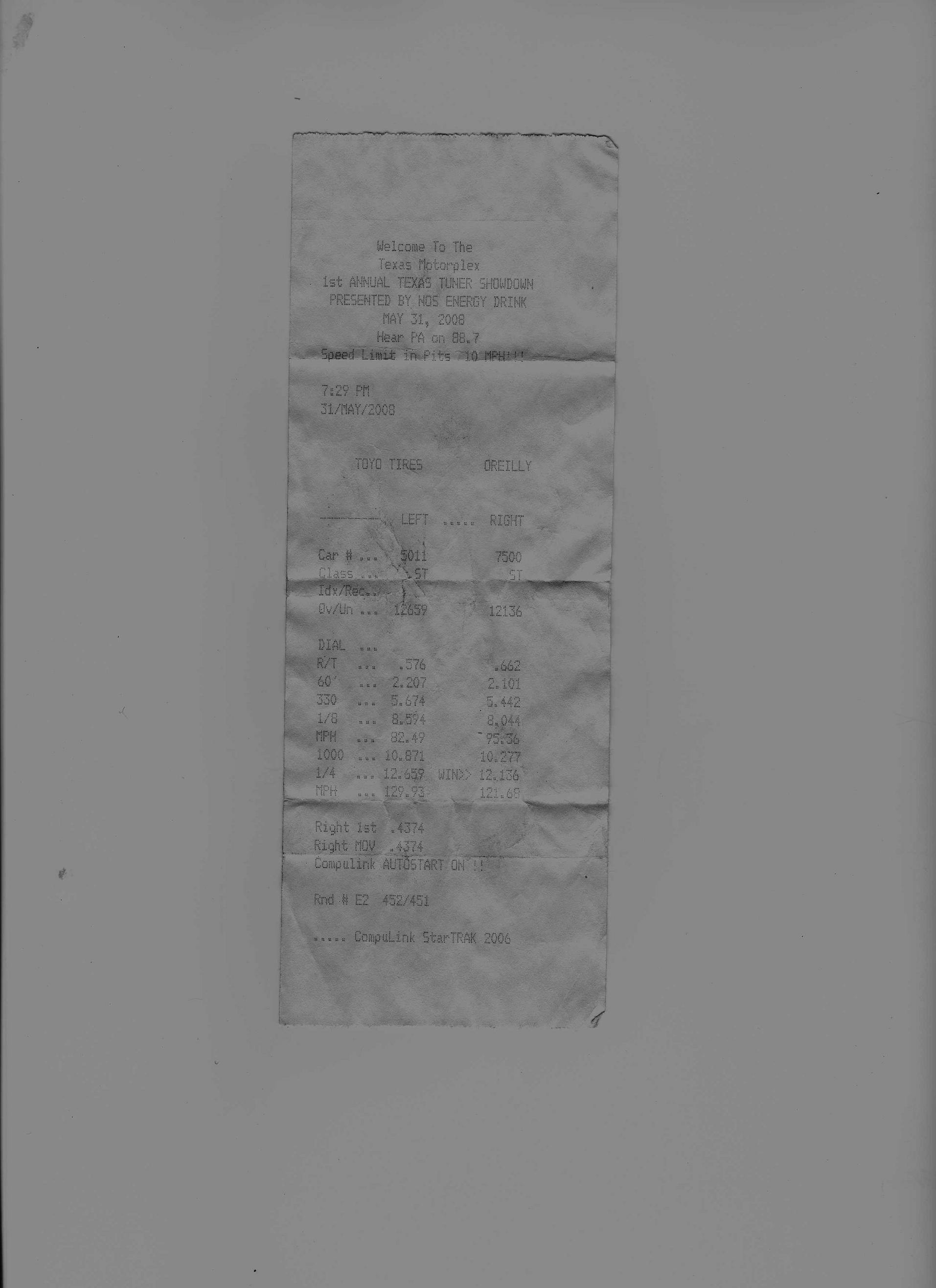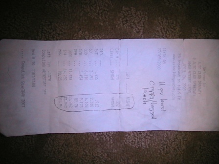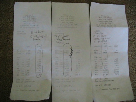 In any case, we all ran...My best run was a 12.7 @ 116 with a 2.1 60'. The car made 368.5 rwhp and 303.3 rwtq, and I'm guessing it was a combination of my skinny tires (225s...255s are on the way) and the heat that didn't let me into the low 12's (or maybe even high 11's). I know several people on the board are making less power and getting into the 11's, but I'm sure it's all about 60' and traction.
