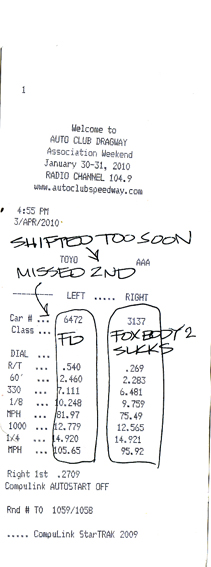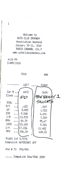 koa nice run. i am in the same boat trying to break into the 10's. my 3-4 shift was terrible you can here me basicly let off on the 11.003 run. need to work on that.