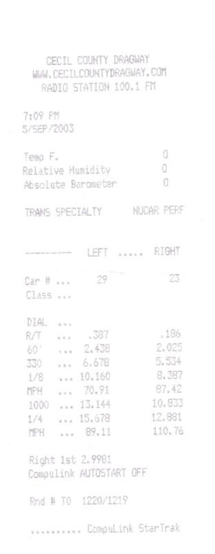 Just got a 13.46@106.55 last night. Traction is definitely an issue I need to address. I'll scan my slip when I can.