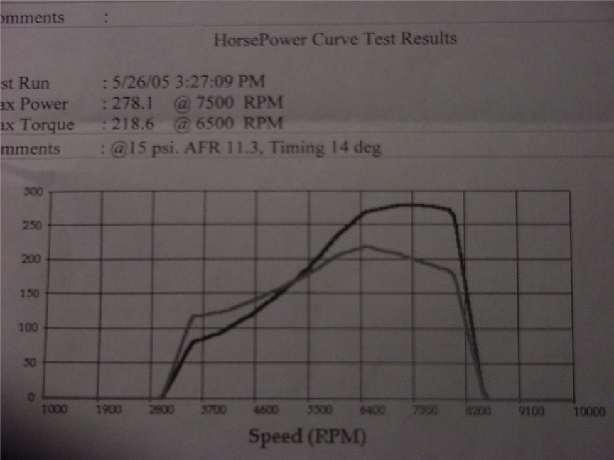 15 PSI? On a Hybrid you should be making more. Looks like your power was dropping up top.( Ported motor too?) On mine it was still climbing. Why do you have so much fuel? 1600cc all the way around is a bit much. Well you might need it someday right =) This is what my car did before tweeking another 4hp out from tunning. (can't find that chart though)